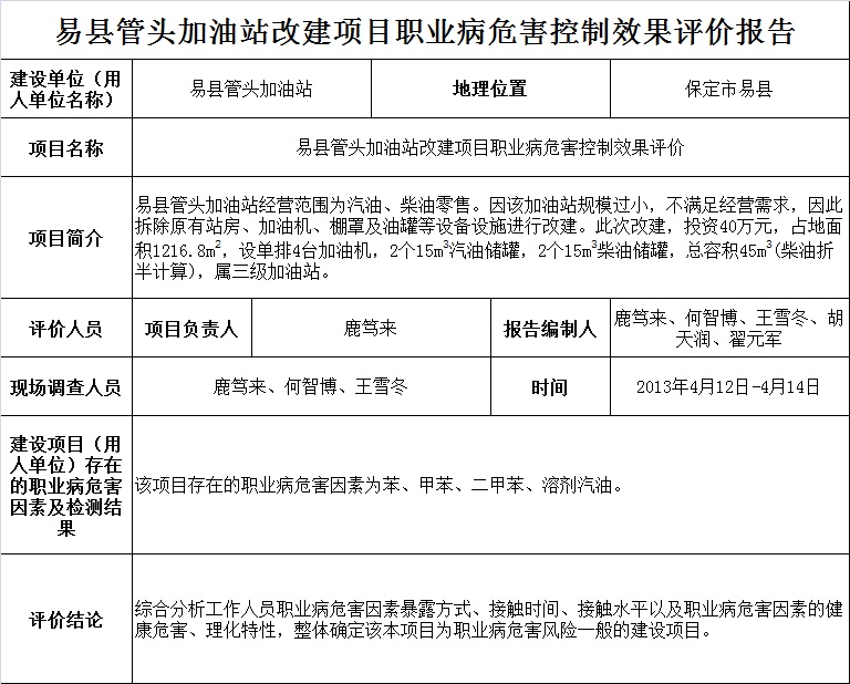 易县管头加油站改建项目职业病危害控制效果评价